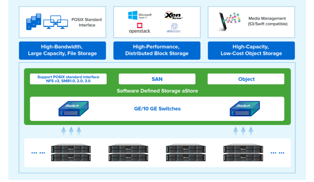 Sangfor aStor menyatukan penyimpanan dalam satu sistem berbasis software yang fleksibel dan mudah dikembangkan. Dengan arsitektur terdistribusi, storage bisa disesuaikan untuk kebutuhan performa tinggi atau kapasitas besar dengan biaya lebih efisien. aStor mendukung storage block, file, dan object dalam satu platform—baik fisik maupun virtual.